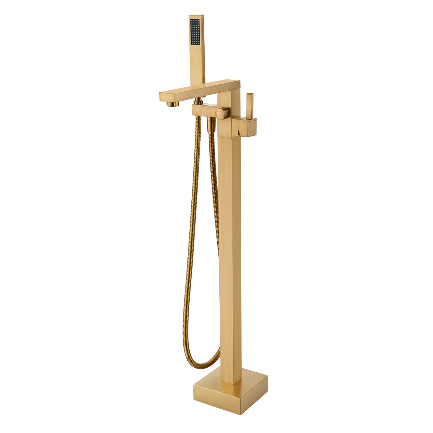 Grifo de bañera independiente, relleno de bañera de oro cepillado, montaje en piso, grifos de baño de latón con una sola manija con ducha de mano