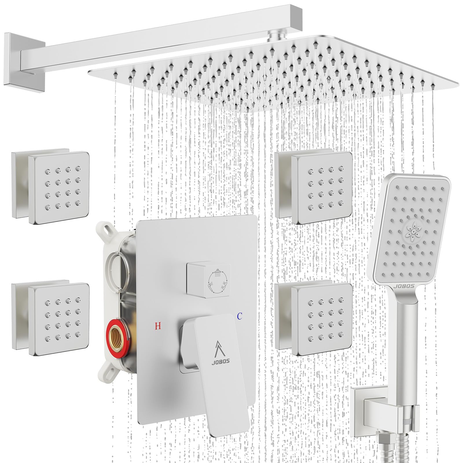 Shower System 12IN Modern Rain Brass Faucet Set With Valve and Diverter Shower Mixer With Handheld High Pressure Square Rainfall Shower Valve (12'' Wall Mount 4 Body Jet, Brushed Nickel)